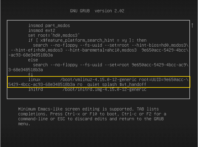 Next press the e key whilst that top line is highlighted. This will take you to the next screen. Use your arrow keys to move down to the line highlighted in the picture below. Use the arrow key until you reach the end of that line.