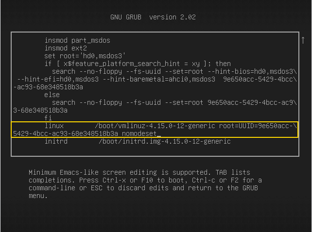 Press the backspace key repeatedly until you remove: ro splash quiet $vt_handoff and replace that text with: nomodeset so that it looks like the picture below.