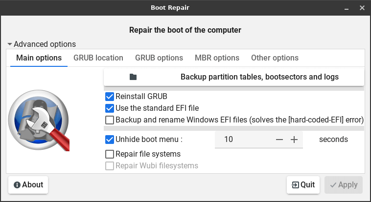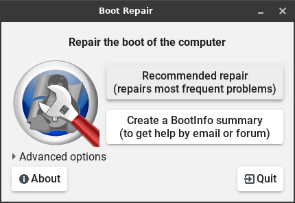 sudo apt-get install -y boot-repair && (boot-repair &)After the install Boot Repair will launch automatically and scan your computer for your boot configuration and other operating systems.
