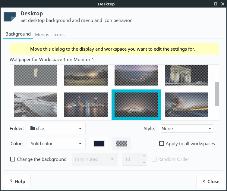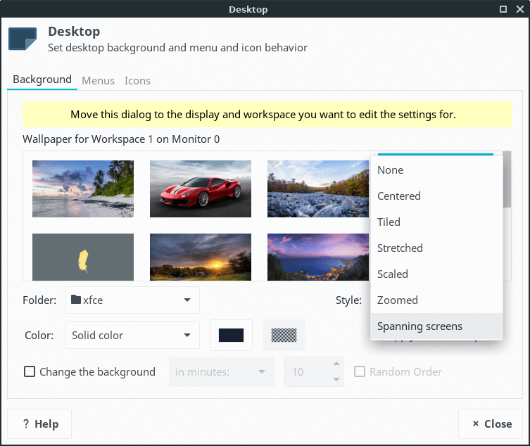 Then move the Desktop settings window back to the monitor with the wallpaper displayed and select Spanning screens from the Style drop down box.