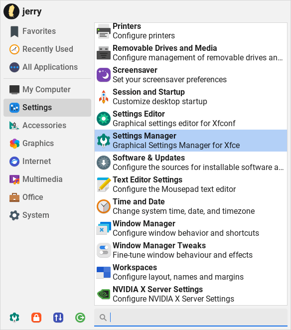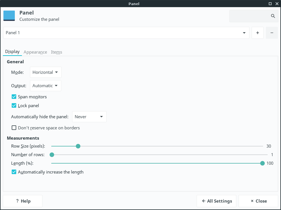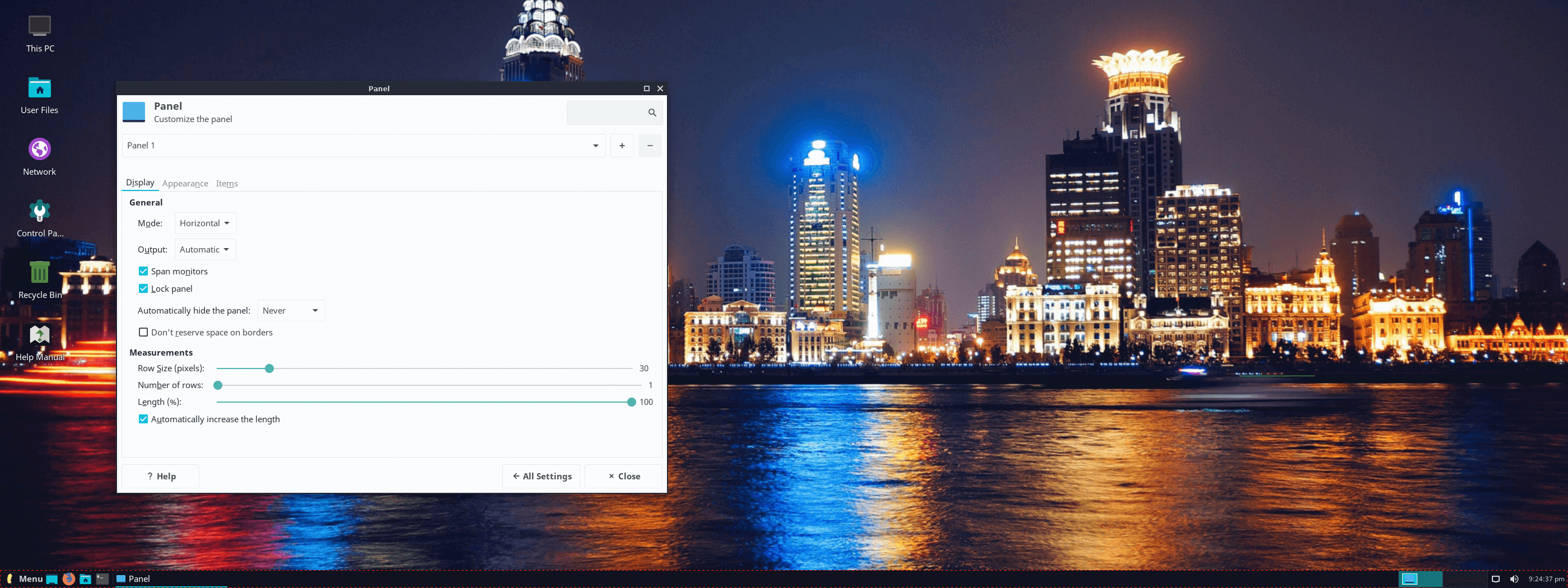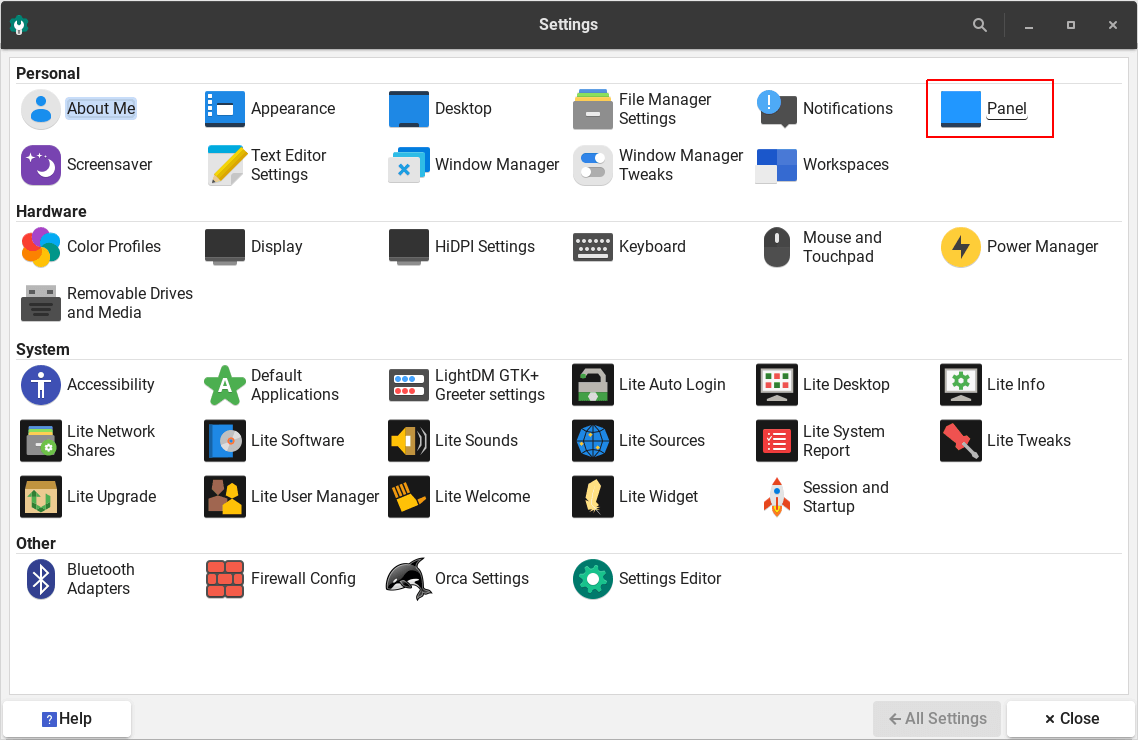 To get your panel to also span both monitors, go back to the main Settings Manager window and choose Panel under the Personal category.