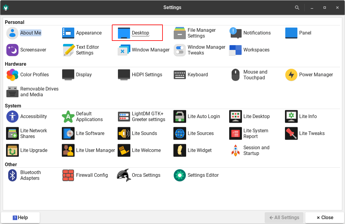 Click All Settings to go back to the main Settings Manager window and choose Desktop under the Personal category.