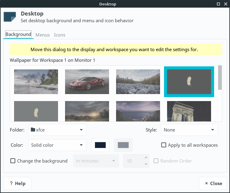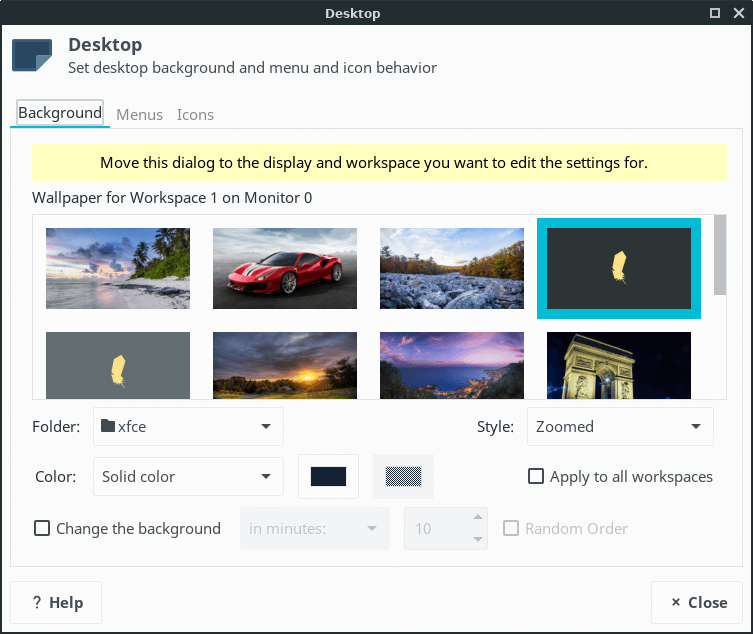 When you drag the Display settings window over to another monitor, the wallpaper that was highlighted on the one you dragged from stays highlighted, but no change will take effect on the second monitor until you actually click on one of the wallpapers. You may set a different wallpaper for each monitor.