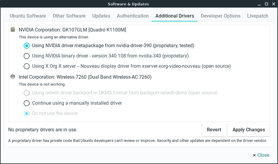 Generally you will want to select the current version, the tested driver. In the above example we selected the Using NVIDIA binary driver (proprietary, tested).