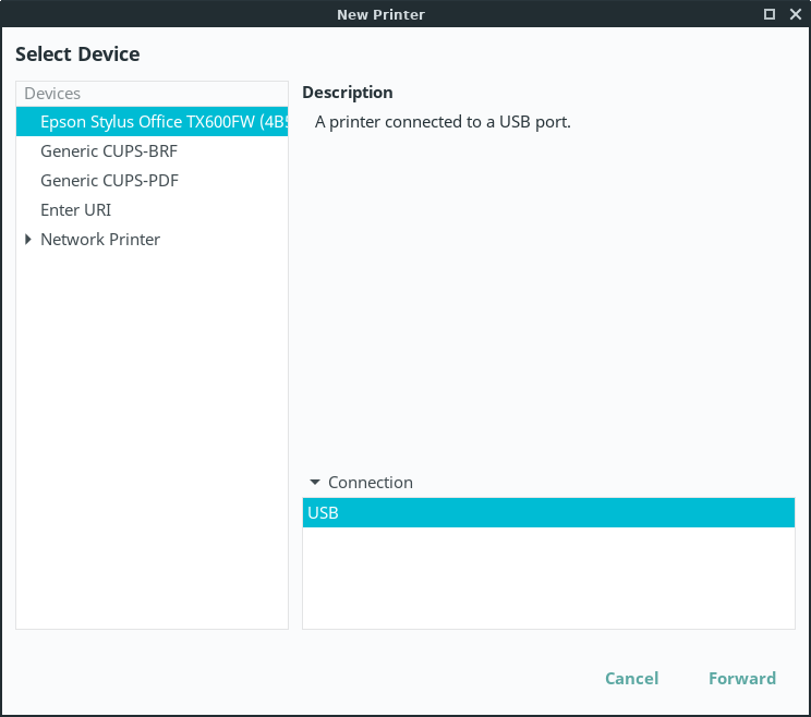 1. Plugging in a printer will prompt a dialog if detected and attempt to find a matching driver. (If your driver was plugged in during your initial install you may not see a prompt, you may refer to step 3 below.)