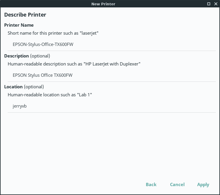 8. Clicking Forward on the above window will bring you to this window where you can set the Printer Name, Description and Location for the printer. However Description and Location are not required, unless you share a printer or use one over a network.