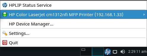 sudo apt-get install hplip-guiOnce it's installed go to Menu, Settings, HPLIP Toolbox. This will place and HP icon in your tray where you can configure and manage your HP printer. Right click on the icon for options.