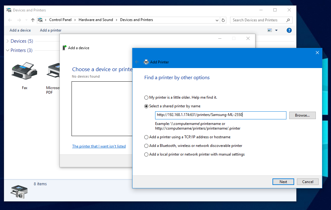 Devices and Printers -> Add a printer - The printer that I want isn't listed.
