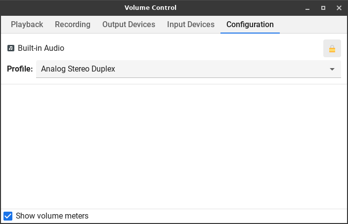 Configuration - this lists known profiles for your sound card. In most cases there is no need to select anything here unless you intend to disable your sound completely, or have a unique profile setting, such as surround sound, mono, or stereo out.