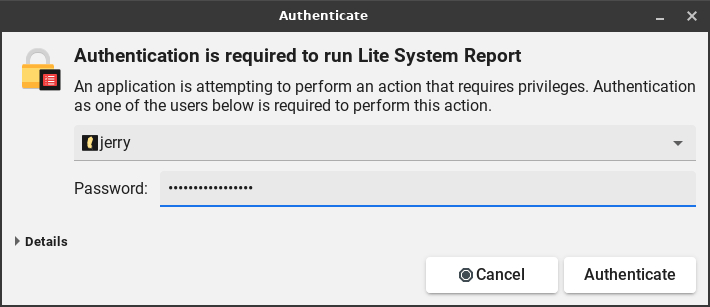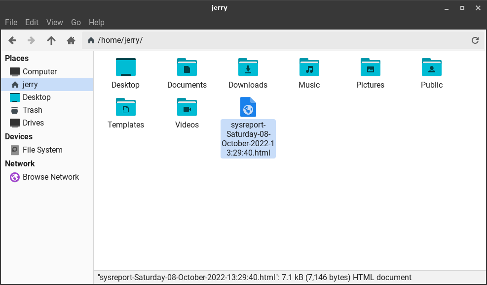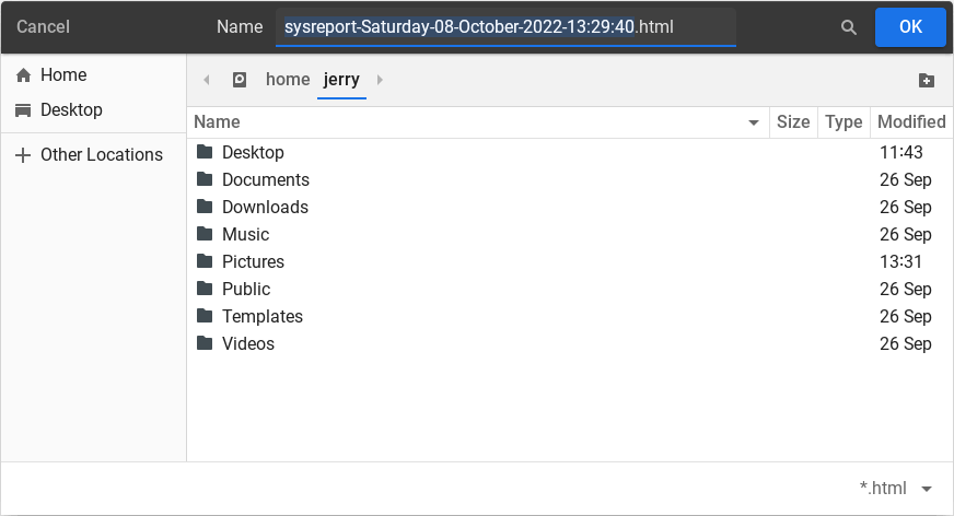 Next you'll be asked where to save the Report, in the following example we select our Home folder (/home/jerry).