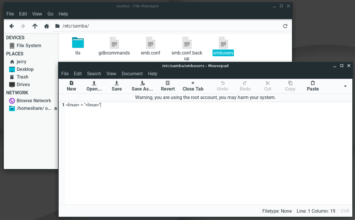 The file will open in the Text Editor. The smbusers file will contain a username map list (one per line) of your Linux Lite and SMB accounts. We will replace the default linux = "linux" in that file with our Linux Lite username in each of the brackets: