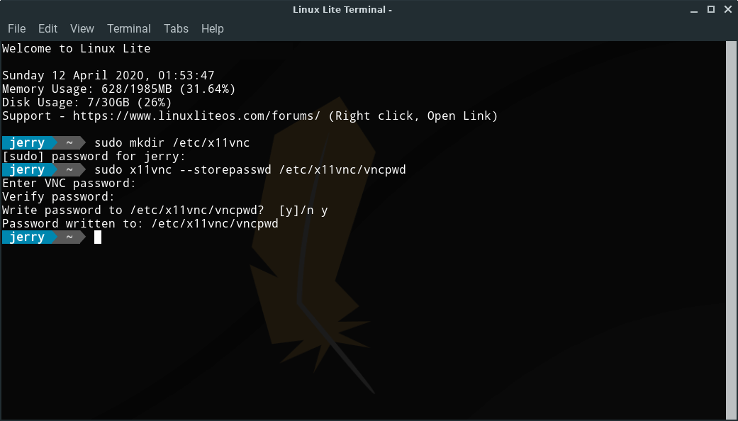 sudo mkdir /etc/x11vncNow we'll create an encrypted password file and save it in /etc/x11vnc/. You will be prompted to type and verify the password: