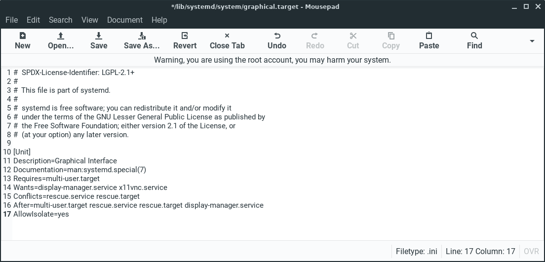 Save changes and close the Text Editor. Then copy /lib/systemd/system/graphical.target to /etc/systemd/system/