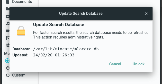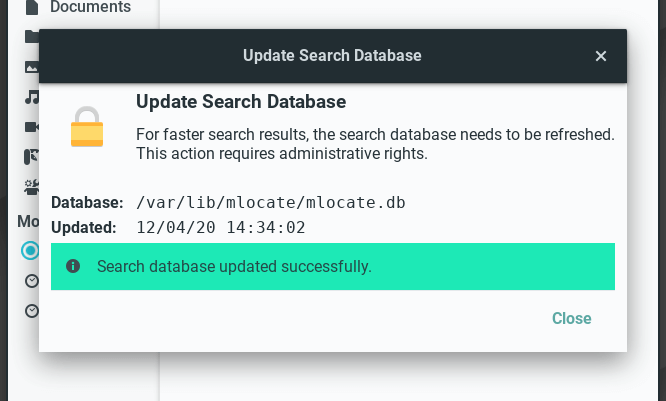 File search uses the locate command to search for files. The locate command relies on a database it maintains of the files on your computer. That database gets automatically updated periodically - normally once a day. Before conducting a search it is a good idea to manually update the database index to make sure that any file changes made since the last update are reflected in the search results.