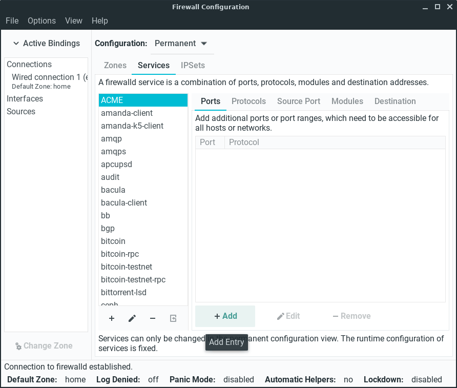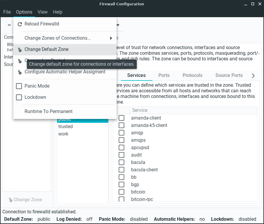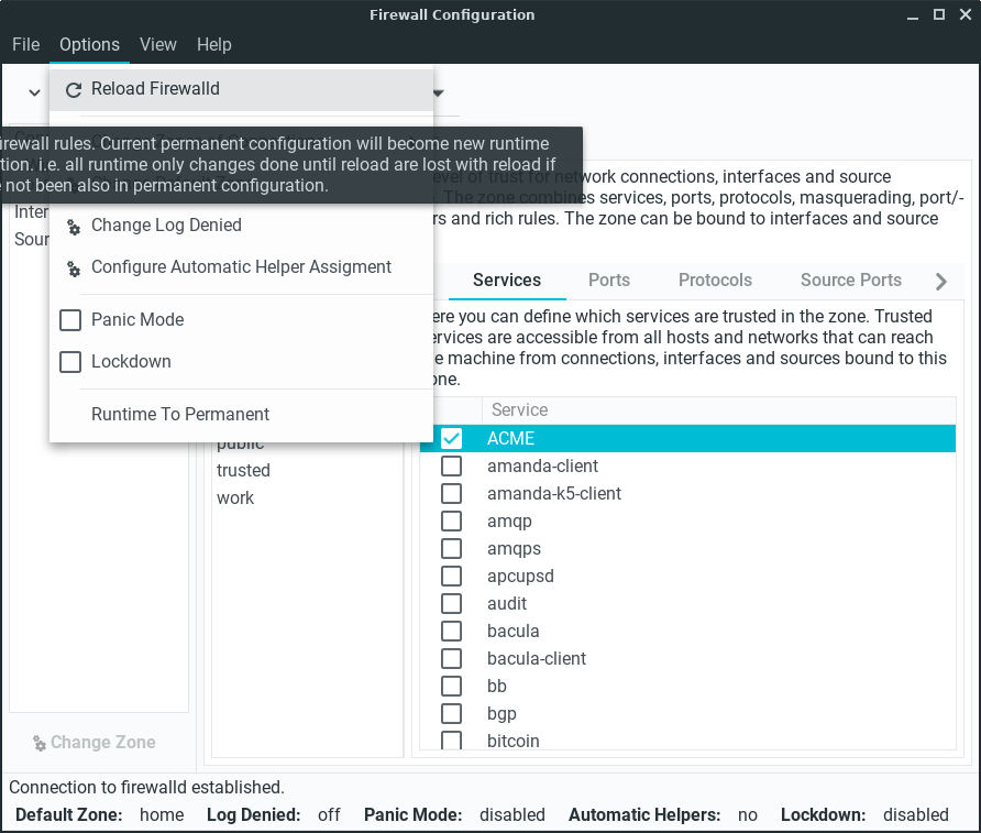 Click on Options, Reload Firewalld to activate our new firewall rule, enter your password if prompted.