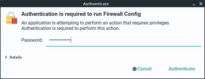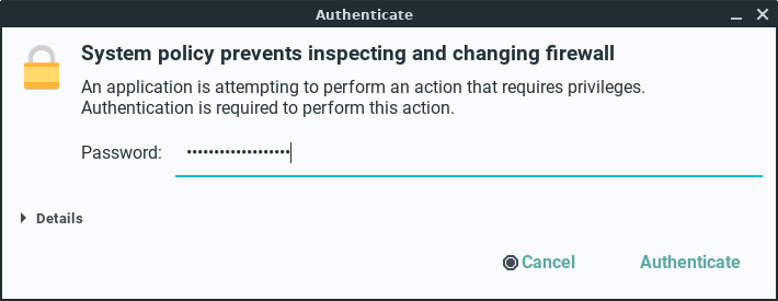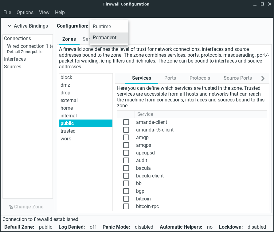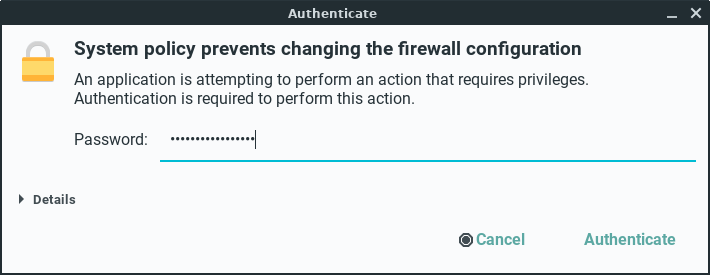 sudo firewall-cmd --stateWith the Firewall enabled, Linux Lite let's through the everyday traffic by default, for example, internet and mail. If you want for example to use DropBox, you will need to make sure it has been ticked in the Services tab, and the relevant ports have been added. Torrent applications and their accompanying ports will also need to be ticked and added to function properly.