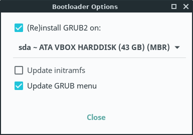 You then specify the Bootloader Options as to whether or not to reinstall GRUB2, to update or not intramfs and the Grub Menu.