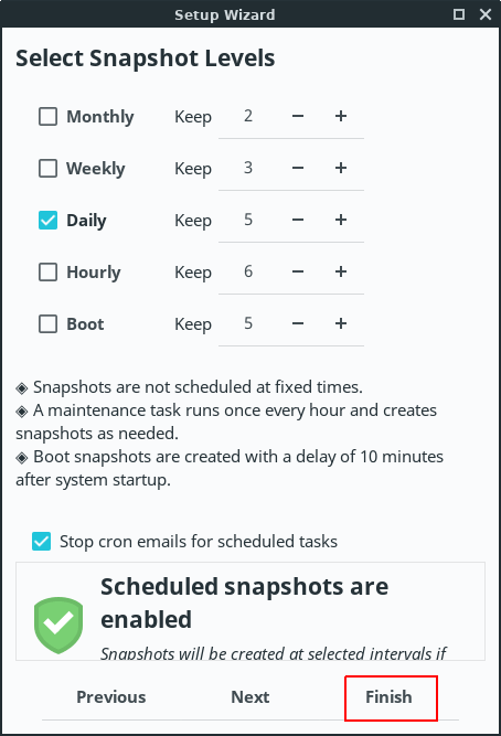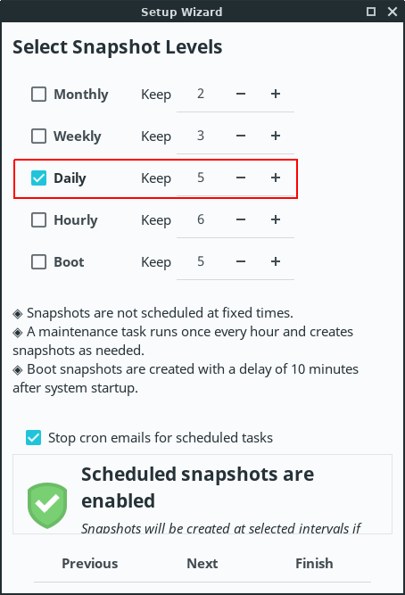 Timeshift allows you to create snapshots on hourly, daily, weekly, monthly or on boot basis. So you can select the frequencies you want and the number of snapshots to keep.