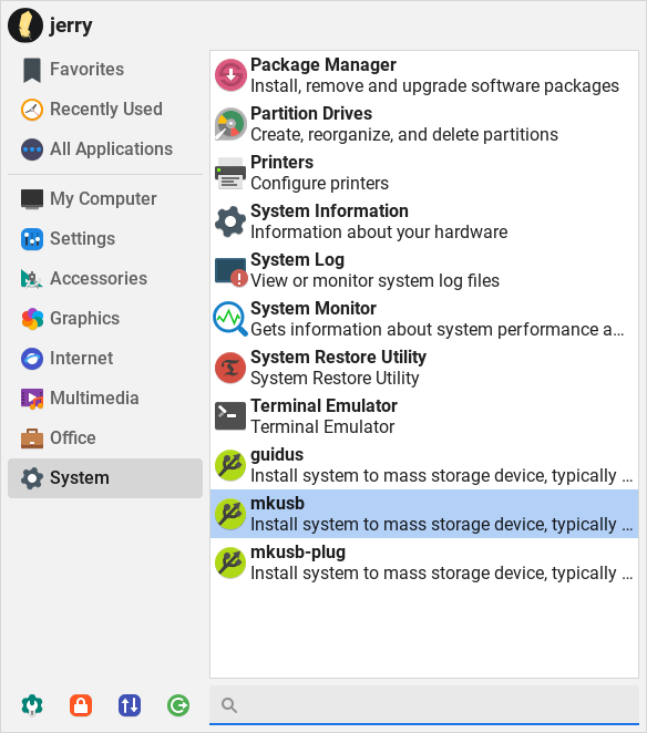 sudo apt install --install-recommends mkusb mkusb-nox usb-pack-efiLaunch mkusb, Menu, System, mkusb.