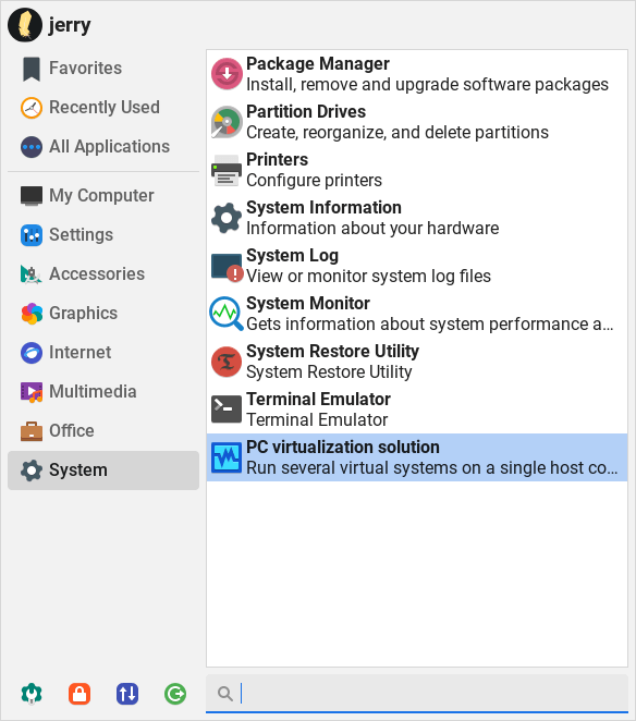 After installation is complete, you will find VirtualBox under both the Accessories and System sections of the Menu as PC virtualization solution.