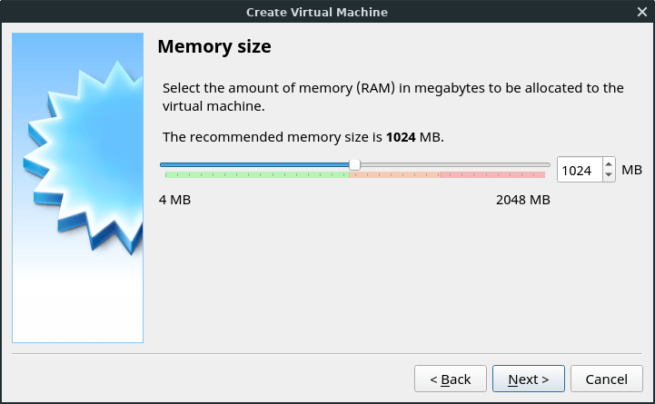 Decide how much of your RAM (memory) you want dedicated to operating the VM. 512MB-2GB will likely be fine most of the time. Do not dedicate more than half of your RAM to the VM - that could cause problems with the operation of your host OS, Linux Lite. (The VM is operating from within the host OS - you don't want the VM using more resources than the host itself.) In this example, the computer (host) has 2Gb of RAM, so 1024MB (1Gb) was allotted to the VM.