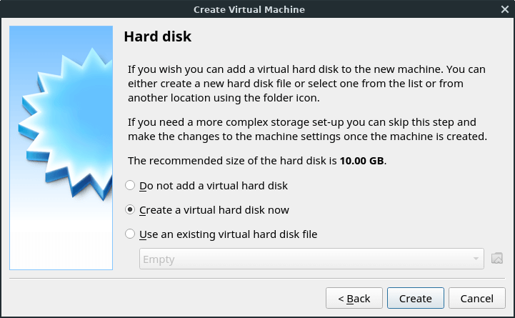 The next screen asks if you want to Create a virtual hard disk now. That is what we want, so we tick that radio button and click Create.