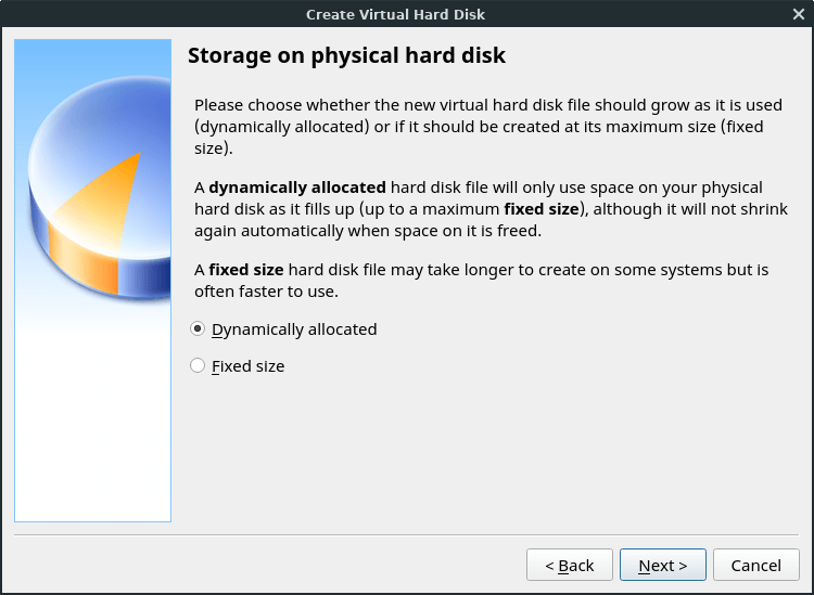 We'll choose Dynamically allocated from the Storage on physical hard drive screen.