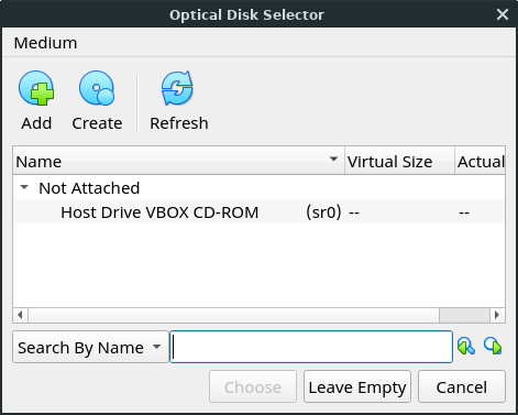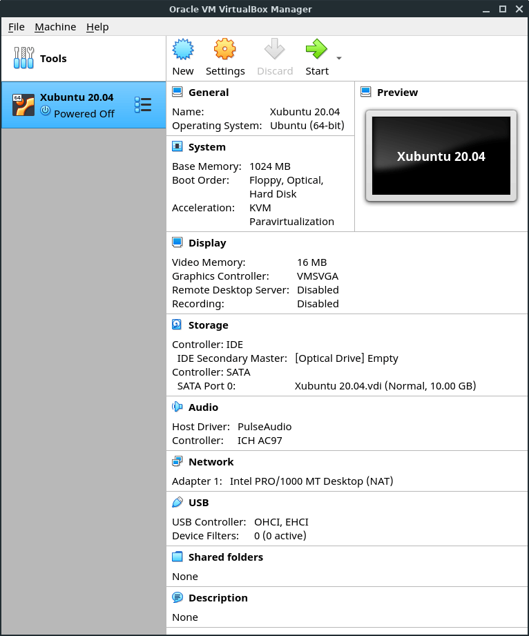After hitting Create your new VM will be listed along the left-hand side of the main VirtualBox window. (At this point, it is just an empty container.)