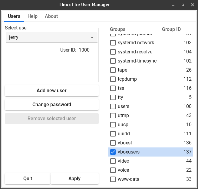 With your username showing under Select user, scroll down the list in the Groups column and place a check in the box next to vboxusers to add yourself to that group and hit Apply.